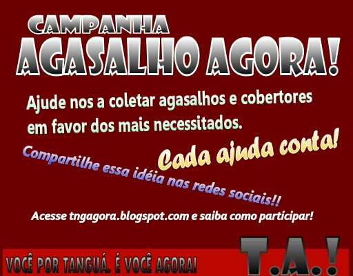 Estamos pedindo a colaboração de todo proprietário de site ou blog da região de Tanguá, Rio Bonito, Itaboraí, São Gonçalo e etc. A intenção é criar uma rede pra compartilhar a campanha; localizar as famílias, moradores de rua, enfim, as pessoas mais necessitadas; Aqueles que puderem contribuir com pesquisas de campo, divulgação da campanha ou de qualquer outra maneira, peço que entrem em contato a partir do email tanguaagora@blogspot.com , dizendo como podem contribuir ou para esclarecer dúvidas . A toda população peço que compartilhem, em quantas redes sociais forem possíveis.